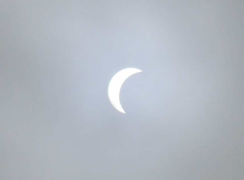 東京では11時12分ごろピーク、という情報から、それまではテレビで中継を見ながら待機していたんだけど、窓外は完全にどん曇り。分厚い雲。まぁ見るのは無理としても薄暗くなることだけでも経験したい、と、11時12分ジャストに娘とふたりでベランダに出て空を見あげたら、なんと、写真のように曇り空に太陽がくっきり浮かび上がってました。逆に晴れてるより観察しやすかったくらい。美しい…。