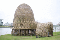 台湾のアーチスト王文志氏が作ったこの作品、右の入り口から中に入れるのだが、この内部がまたとても気持ちがいいのである。竹で精妙に編みこんだ空間は外に向かって閉じている。でも、信濃川が流れる音や新潟の街で生きている人たちの生活音、鳥の声、そして空からの光、川に反射した光などが、竹の隙間から川風とともにスルリと入ってくる。閉じているのに開いているこの不思議な感覚。