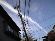 今朝の犬散歩のときに見た雲。これっていわゆる地震雲? ヒコーキ雲にしてはぶっとくて長い。
