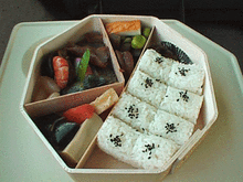 よくお邪魔させてもらっているこのブログで読んで始めて知って驚いて、とりあえず iPhoto のデジカメ数万枚の中から探し出してきたのが左の写真。1997年9月に新幹線内で写した水了軒の名作弁当「八角弁当」である。当時はまだ画素数低いから、なんか画面荒れてるけど。
