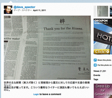 でも、やっぱり国の意見広告となるといろいろなところから手が入る(当然菅首相からも入りまくったらしい)。それでも写真の「デーブ・スペクターのツイート」のように、なんとかギリギリ役立ったのかなとは思う。こういう襟を正した広告はやはり新聞だなぁ。海外首脳・国民の反応も良かったと聞く。いろんな意見・批判はあるとは思うが、震災一ヶ月で世界に対して感謝を述べるのは必要だと思うし、やらないよりずっとマシかと。