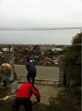 午前中はあるお宅の庭の泥かき(ヘドロをかきだす)。道1本隔てて向こう側は津波で跡形もなく流されている。このお宅の家は残っているが家の中も外もヘドロだらけ。それを30人で一気に片付けていく。