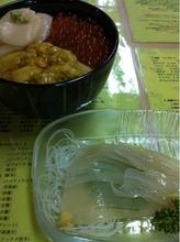 ツイッターでランチにいい店を訪ねたらたくさん情報をいただいたので、その中から複数の方のオススメがあった「きくよ食堂」朝市本店へ。有名店らしい。そこで出始めの真イカ(スルメイカ)のイカそうめんと、旬のウニ(塩水ウニ)を使った巴丼(ウニ、イクラ、ホタテ)を食べた。真イカはまだ小さかったが、味はなかなか。