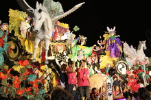 なんというか、紅白の小林幸子を数倍凄まじくして、それが二十数台の山車として練り歩く感じ。しかもその山車が合体ロボ的で、せり上がったり広がったり蒸気を出したりシャボンを出したり様々に動く。