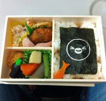 弁当売り場に並んでいたサンプルとペンギンの表情が違うので、たぶんいろんな表情のペンギンがいるんじゃないかな。ペンギンのすぐ下にはニンジンのお魚もいる。上手だなぁ。おかずを入れる小さなカップや仕切りなんかも全部かわいい。隅々まで気配りが行き届いたいい弁当。味はまぁ普通だったけど、でも、普通にお母さんが作ったような手作り感が逆にいい感じの味だった。