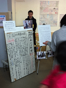 会場での新聞配りである。土日2日間の開催で、約7万人を集めるというビッグ・イベントに成長したワークショップ・コレクションなので、展示ブースの前はものすごい数の人が通る。そこで新聞を無料で配る。展示ブースでは被災地へのメッセージや募金も受け付けた。貴重な手書き壁新聞の現物展示もあった(上の写真)。