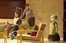 人間たちに交じってアンドロイドやロボットが実際に出演し、演じる。ちなみにロボットは機械で、HONDAのアシモを想像してもらうと早い。アンドロイドは生身の人間にとても近く作られた、合成樹脂の、リアルな見た目のもの。車イスにのって現れる。