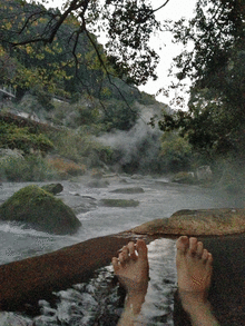 写真は川沿いの椋の木野天風呂での早朝風呂。