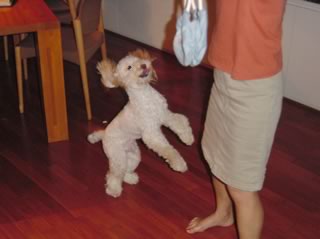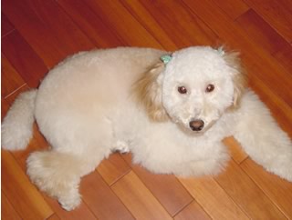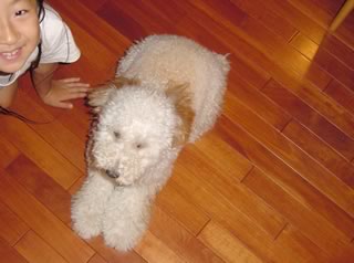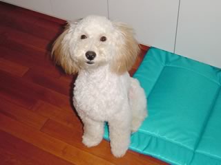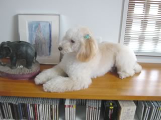 ということで、カットしたのだが…。 オスなのにリボンなどされてめちゃ不本意!美容室側は「トイプーにはリボン」と決めているらしく、なんかデフォルトでリボンつけるらしい。やめてくれー。嫌いなのだー。 しかし、上の写真の見比べると同じ犬とは思えんな。 生後9ヶ月。2003年6月