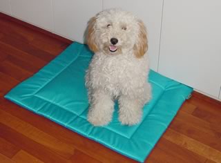 ばっさりカット直前のモップ状態。 下に敷いているのは冷却シート。中に保冷剤を入れる仕組みになっていて、暑い昼や夜に彼のベッドになる。冷たくて気持ちいいらしい。 生後11ヶ月。2003年8月