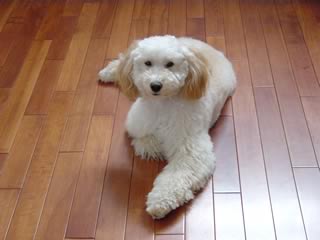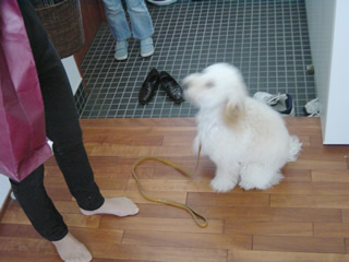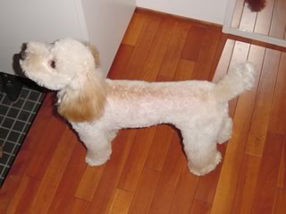カットに行ってすぐのころ。もう成犬値段で8000円。たかっ! 毛がほとんど抜けないのは素晴らしいが、カットにこれだけかかるとつらい。ちなみにボクは4500円。節約のためもう3ヶ月カットに行っていない。人犬転倒。