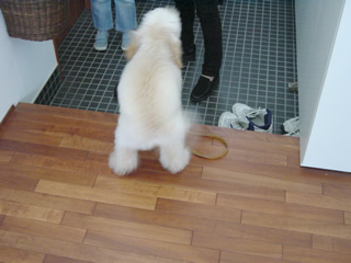 散歩前の大騒ぎ(1)。 綱(リード)を持つだけで大騒ぎし、首輪をつけるのに一苦労。で、首輪をつけ終わったら玄関に飛んでいき、早く行こう早く行こうと興奮しまくる。 ←マウスを重ねて雰囲気をお楽しみ下さい。 生後8ヶ月。2003年5月