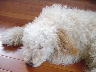 1ヶ月もほっておくとこの写真のようにカビだらけチックな不思議犬に。道を一緒に歩くと「何犬ですか?」とみんなに聞かれる。うぅ。ブラシくらいかけてやれよって感じ。 そろそろ暑い日も出てきたので、ばっさりカットしてやろうと相談しだす。 生後10ヶ月。2003年7月