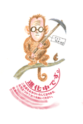 ボクをサルにして「進化中」と、ただそれだけです。 このころは丸いメガネをかけていたんですね。顔も似てない感じ。 コピーは「ご迷惑をかけております。注意しておつき合いください」と。 すいません。いまだに進化中。