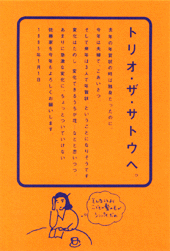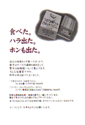 1999年は「うまひゃひゃさぬきうどん」と「ジバラン」を出版した次の年。 んでもって、こういうコピーに。 ボディは「尚之は相変わらず食べてばっかり。優子はチーズの講師も初めまして。響子は幼稚園に入って喜んでいます。そんな佐藤家ですが、昨年は本も出してしまいました。(後略)」 みたいな感じ。