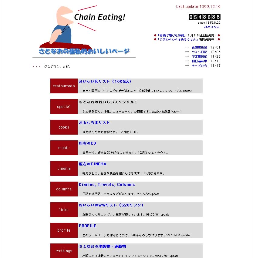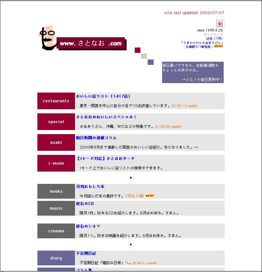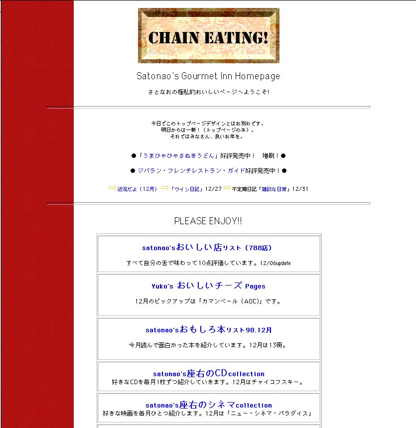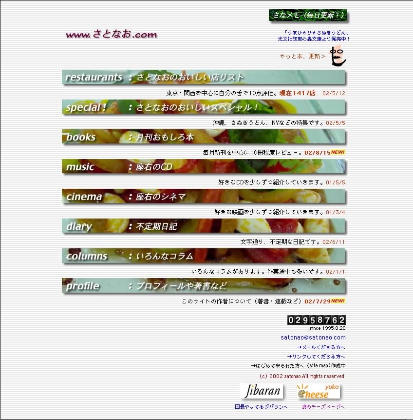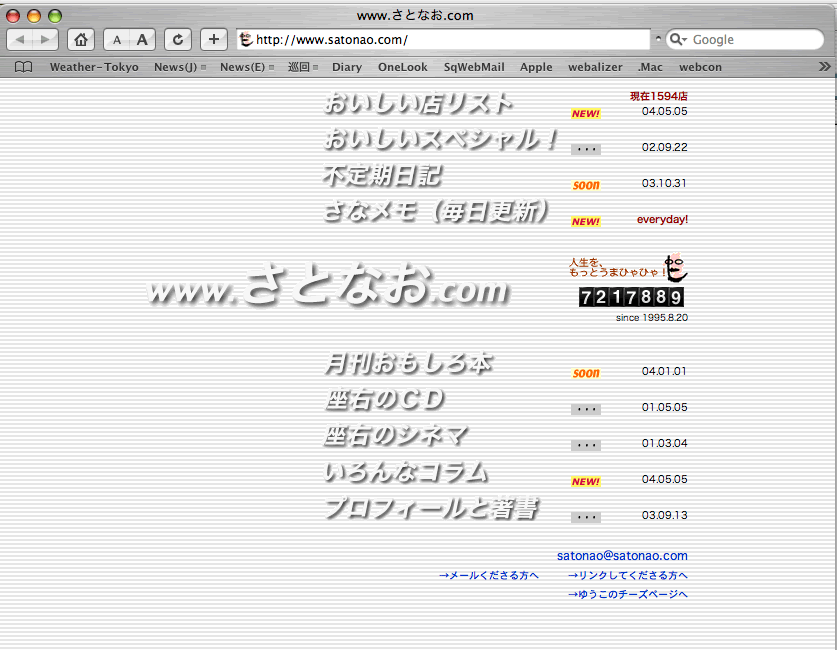 2000年1/1から、www.satonao.comに移行。それにともなう大リニューアルに関しては、こちらの日記にくわしく書かれてます。幻のデザインも! |
