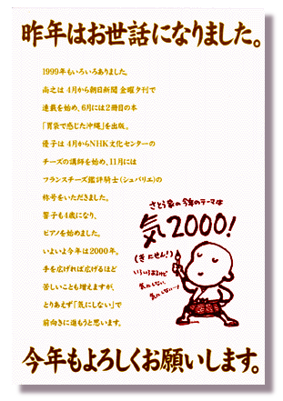2000年、あけましておめでとうございます。 このページにアクセスしてくださった方はおわかりかもしれませんが、ホームページを今日付けで引っ越しました。 「www.ckp.or.jp/satonao/」から「www.satonao.com」へ引っ越したのです。 マイ・ドメインを取得して、ますますやる気になっているので、今年もいろいろよろしくお願いしますね。 年末から悪性の風邪にかかってしまいました。 元はといえば幼稚園で流行っていた風邪なのです。 あの、いったん口に入れたものは釘でも飲み下す、という娘の響子がある日、生まれて初めて吐いたのです。 そう、4歳にして生まれて初めて、吐いたのです。 いままでどんなに調子が悪くても吐かなかった、あの、驚異の食欲魔人が、生まれて初めて吐いたのです(しつこいって!)。 で、その日から2日間、響子は上からも下からも水状のものを吐き出し続け。 看病に右往左往していたのですが、まぁ幼稚園仲間の多くが同じ症状の風邪をひいていたので、変な病気かも、という心配はなかったんです。 でもその風邪が・・・ついにボクにまで・・・。 つうか、大人な分、抵抗力があるのでしょう。 吐きはしませんでした(一度口に入れたものを出すのは人生観として許せない)。 でも、下からは・・・タイ王国出張以来のナイアガラ瀑布状態。 ドドドドドド!!!!! これを機にやせればいいじゃない、という鬼妻の言葉を素直に受け、胃に食物を入れない3日間。 おかげでちょっとマシになってきたのですが、これを書いている12月31日の深夜でもまだ華厳の滝程度はドドドです。あぁ・・・。 でも佳境にさしかかっていたホームページ引越作業が滞ったのが痛かったなぁ。 まぁ、いいのだ。 ホームページだって、なにも1/1に更新したかったすべてのファイルが完成してなくてもいいのだ。 ホームページ以外にもいろんなヤなことが立て続けに起きた年末年始だったけど、別に命取られるわけでもなし、生きてりゃそのうちいいことあるのだ。 そう、今年のテーマは「気2000!」である。 気にせん! と読んでほしい(単なるダジャレじゃん)。 いや、なんというか、根が真面目なものでいろいろ気にしちゃうんですよね。 いろいろあるけど、気にしない気にしない! 気にしないぞー! 絶対気にしない! 死んでも気にしない! 気にするもんか! 「めいっぱい気にしてるじゃない」 はぁ。だからこそ今年のテーマは「気2000!」なのです。 今年も、よろしく。ね。 p.s. おまけ。 今年出した年賀状。 ![]() これだけではなんなので、過去の「年賀状ギャラリー」を作ってみました。 昔は4色刷で気張ってたのね、って感じだけど、なかなか面白いのもあるので、見てみてください。 「さとなお年賀状ギャラリー」はこちらから。 |
