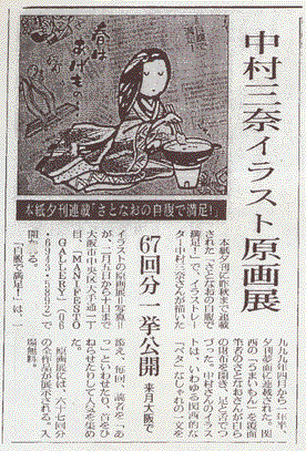 前回の日記には賛否両論いろいろメールをもらってしまった。 教育って100人いたら100人考え方が違ったりするから、こんなのについて書いたらきっと面倒くさい事態になるに違いない・・・ってわかっていたのに、わかっていたくせに、わかっていたはずなのに、ばかやろーーー! そのうえ、あの日記、イイタイコトにたどり着く前に眠くなっちゃって、問題点を羅列しただけで寝てしまい、「あー、結論も書かず、推敲もせずに『ま、論文じゃなくて日記だし〜』ってアップすると結局あとで後悔するんだよなぁ・・・」ってわかっていたのに、わかっていたくせに、わかっていたはずなのに、くそやろーーー! さらに、推敲が十分じゃなく稚拙なせいで、その問題点の羅列すらいろんな人に誤解され、「うー、そういうことが言いたいんじゃないんだけどなー」と思っても、もう後の祭り。 つうか、優子とワイン飲みながら3時間くらいかけて話したことをそのまま文章にするのはもとから無理じゃ。 ま、非常に簡単に言い訳すると、 ・歯車は結果であって目的ではない、のはわかってますよん。 教育の方向性を歯車で象徴しただけ。 ・歯車な自分を嘆いているわけではないよん。 個性重視!とかいう声高な主張への違和感をとりあえず表明しておこうとして 文章が破綻しているだけ。あそこらへんで眠くなったんだもん。 ・学校教育は国の都合、というのは極論だというのはわかってるよん。 でも、いろんな要素を削っていくと、そうなるのではないか、 ということ。型にはめようとしているのは間違いないし。 いまは国の影響力が薄いけど、もしどっかの国に占領されたら いきなりその国に都合のいい教育が始まると思う。 もちろんそれも極論。でもそういうこと。 他にもいろいろあるけど、まぁいいや。 賛成メールもそれなりにあったしね。 ま、みなさんが教育を考えるキッカケになればいいということで。むはは。 え? 結局イイタイコトはなんだったのかって? つまりあの日記では、学校教育の性格を定義して、学校教育の限界を示して、近代学校教育の問題点をわかりやすく提出して、そのうえで、家庭教育に話を引っ張りこんで、そんでもってわが娘響子をどう育てるか、というところまで話を持っていこうとしていたのね。 んでもって、全体の40%書いたところで力尽きたのが前回。 そう、あれでまだ半分行ってないような分量のものを書こうとしてたわけ。 つうか、それって日記か? という疑問が胸に激しく去来するのではあるが。 ま、「狭育のゆくえ(2)」を続けて書けばいいかと思っていたけど、教育論はよっぽど推敲して慎重に書かないと怖いということがよくわかったので、とりあえずアレはアレで終了。 「うーん、それではアンマリだ」という人のために、途中を抜きにしてイイタイコトだけ簡単に書くと、「要は親が人生を楽しそうに姿勢良く生き抜くことが、その姿をきちんと子供に見せることが、教育の要諦ではなかろうか」みたいなことを書こうと思ったんだな。 はは。前段がないとまるでわからん。 ええと、噛み砕くと、「響子が『はやく大人になりたい』と思うような、『はやく大人になって人生を楽しみたい』と思うような、そんな人生を親であるボクたちが日々送ること。そしてそういう人生をきちんと彼女に提示すること。それこそが、本来型にはめることを目的としている教育事情の中で、子供を育てていく最良の方法ではないか」みたいなこと。 むはは。もっとわからんか。 まぁいいや。あとは適当に想像してください。 つうか、ご自分でお考えください(と、逃げておく)。 さて。 話はスパッと変わって、中村三奈さんの話である。 ![]() これは、先月末、朝日新聞の朝刊に掲載された記事である。 見出しドアタマがいきなり「中村三奈」である。 大きなフォントである。 犯罪者並みである。 すげ〜〜! 朝日新聞で去年の9月まで連載していたボクのコラムのイラストを1年半に渡って書き続けてくれた彼女。 その原画展が大阪であるのだが、それが朝日新聞朝刊にこうも大きく載るとはなぁ・・・(喜田さん、ありがとう!)。 実は、中村三奈さんはほとんど「戦友」の仲なのである。 CMの仕事はプランナーのボクが案やコピーを考え、それをスポンサーにプレゼンテーションするところから始まるのだが、その際、絵コンテというものを作成しないといけない。 つまり、実際にどういう風にCMが構成されるのか、イラストとコピーとト書きで相手にちゃんとイメージを説明できるものを作らないといけないのである。 三奈さんは、そのころそれなりに売れていたイラストレーターだったのだが、ちょっとしたツテでボクたちのチームは彼女をそのコンテ・ライターとして使えることになったのであった。 イラストレーターはあまりコンテの仕事はしない。 コンテは専門のコンテライターが書いてくれることが多い。 三奈さんはイラストレーターだから、最初は「今回だけの特